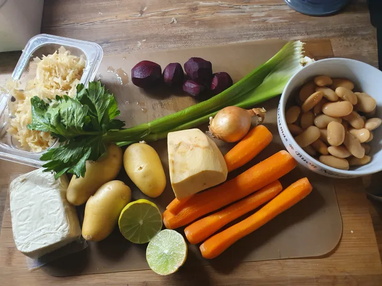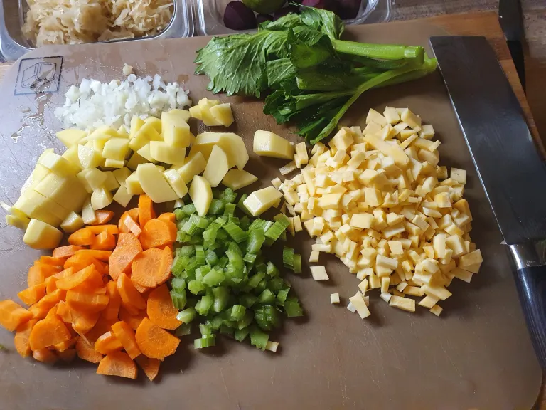 Für die Suppe die Zwiebeln klein schneiden, Selleriestangen, Steckrübe, Kartoffeln (geschält), Karotten klein schneiden und alles anschwitzen mit 2 EL Olivenöl und ca. 5 min schmorren lassen.