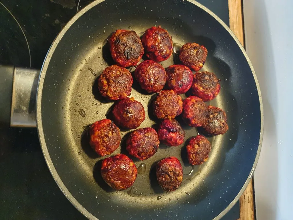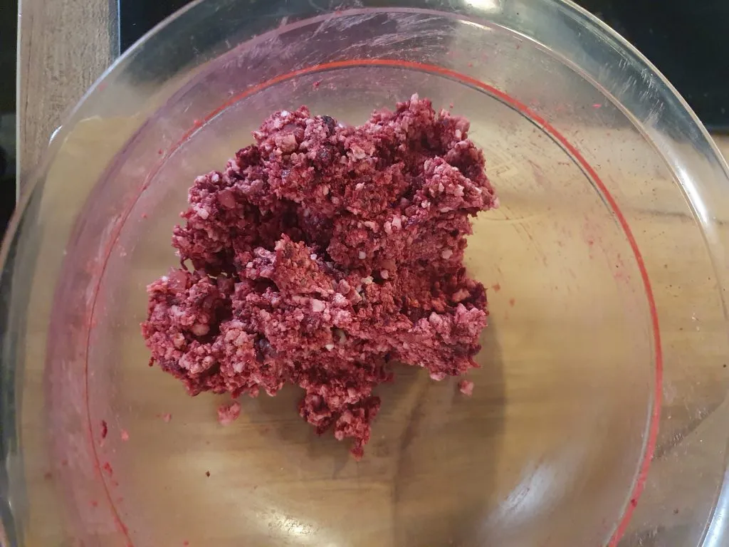 In der Zwischenzeit machen wir die Rote Beete Bällchen. Den Tofu in eine Schüssel zerbröseln. Die Rote Beete schälen und fein raspeln, 1 EL voll zur Seite stellen fürs Garnieren. Geraspelte Rote BeeteSenf, Tomatenmark, Salz, Pfeffer, Paprikapulver, Maisstärke, Semmelmehl und Guarkernmehl zum Tofu geben. Alles gut vermischen und mit den Händen durchkneten. Wer es gern scharf mag, kann natürlich auch noch Harissapulver hinzugeben. Mit feuchten Händen kleine Klößchen formen und in einer Pfanne mit etwas Olivenöl kross braten.