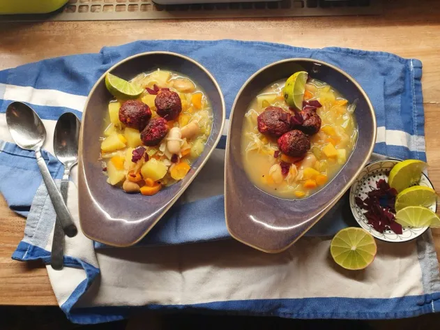 Die Suppe noch einmal abschmecken und in Teller füllen. Klößchen dazugeben und mit einem Limettenstück und etwas geraspelter Rote Beete garnieren.