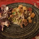 In der Zwischenzeit machen wir die Rote Beete Bällchen. Den Tofu in eine Schüssel zerbröseln. Die Rote Beete schälen und fein raspeln, 1 EL voll zur Seite stellen fürs Garnieren. Geraspelte Rote BeeteSenf, Tomatenmark, Salz, Pfeffer, Paprikapulver, Maisstärke, Semmelmehl und Guarkernmehl zum Tofu geben. Alles gut vermischen und mit den Händen durchkneten. Wer es gern scharf mag, kann natürlich auch noch Harissapulver hinzugeben. Mit feuchten Händen kleine Klößchen formen und in einer Pfanne mit etwas Olivenöl kross braten.