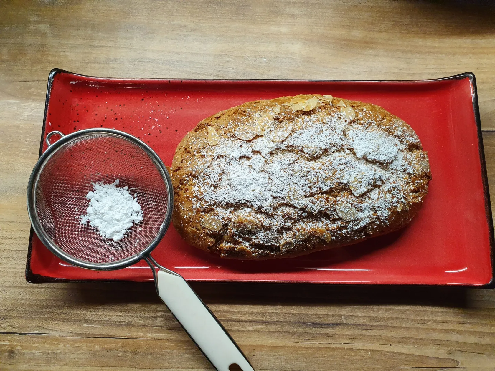 Mehl, Eier, Zucker, Butter, Salz, Vanille, geriebene Zitronenschale, kandierte Früchte und Pflanzenmilch in einer Schüssel miteinander verkneten. Ihr könnt auch das Mehl auf die Arbeitsplatte geben und eine tiefe Mulde ins Mehl drücken. In die Mulde die Zutaten geben und alles verrühren. Dabei immer mehr Mehl in die Masse einrühren bis der Teig dicker wird. Dann mit den Händen alles zu einem weichen Teig verkneten. Es wird ein weicher lockerer Teig. mit bemehlten Händen den Teig in 2 Teile teilen und kleine Laibe formen. Diese auf ein mit Backpapier ausgelegten Backblech legen. Mit etwas Pflanzenmilch bepinseln und die Mandeln darauf verteilen. Die Laibe 30 min backen bis die Teigoberfläche goldgelb ist. Den Laib aus dem Ofen holen und abkühlen lassen. Mit etwas Puderzucker bestreuen und in Scheiben schneiden.