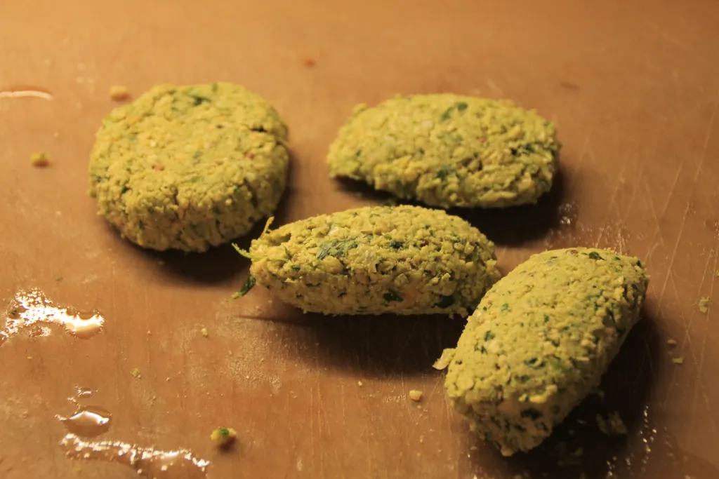 In der Zwischenzeit aus der Masse kleine Falafel formen. Wichtig hierbei ist, dass die Masse gut zusammengedrückt wird. Es gibt richtige Falafellöffel zum formen. Aber 2 Esslöffel mit denen ihr Nockeln formen könnt funktioniert sehr gut. Ihr könnt die Falafel auch mit der Hand formen. Dabei bitte den Teig fest drücken.