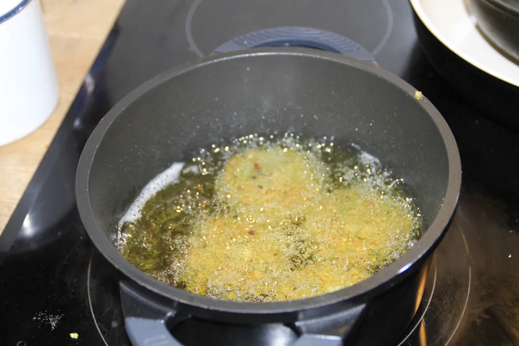 Ein Topf mit ca 1 l Rapsöl auf 160 Grad erhitzen.
