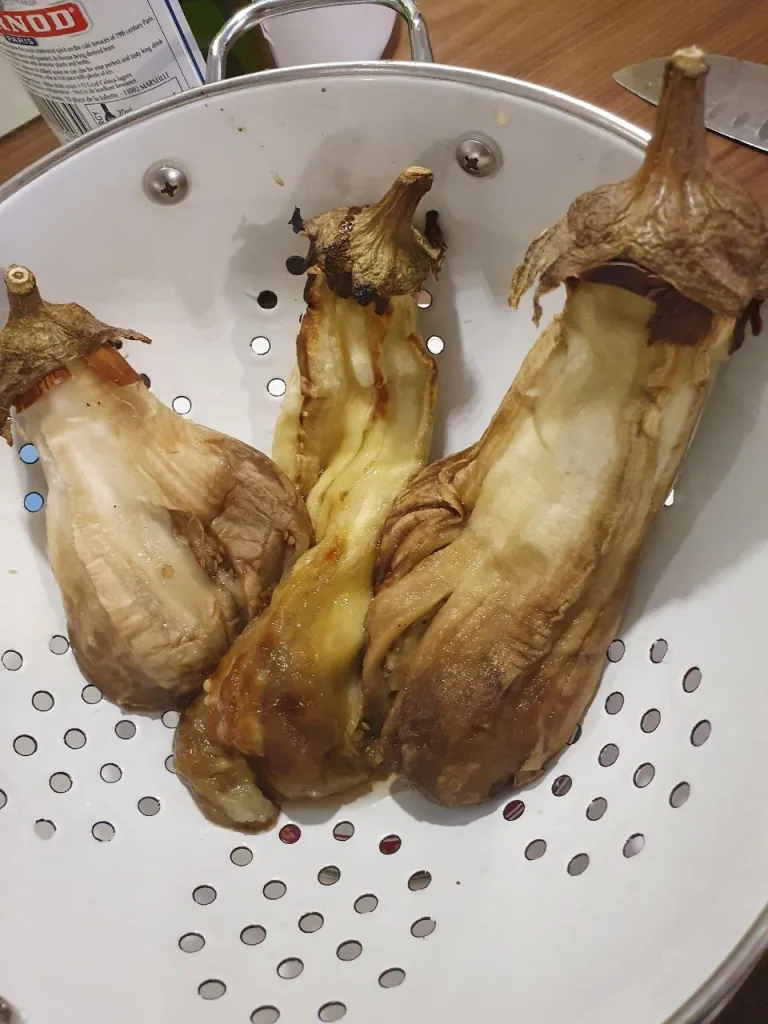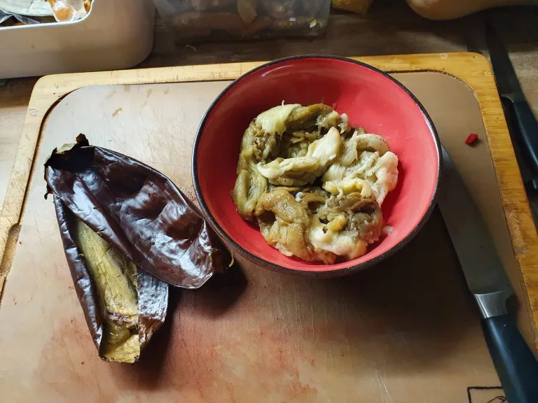 Die Aubergine so heiß wie möglich von der Haut befreien und im Anschluss in ein Sieb legen und mindestens 1 Stunde abtropfen lassen. So verliert die Aubergine Flüssigkeit, die sonst den bitteren Geschmack verursacht.