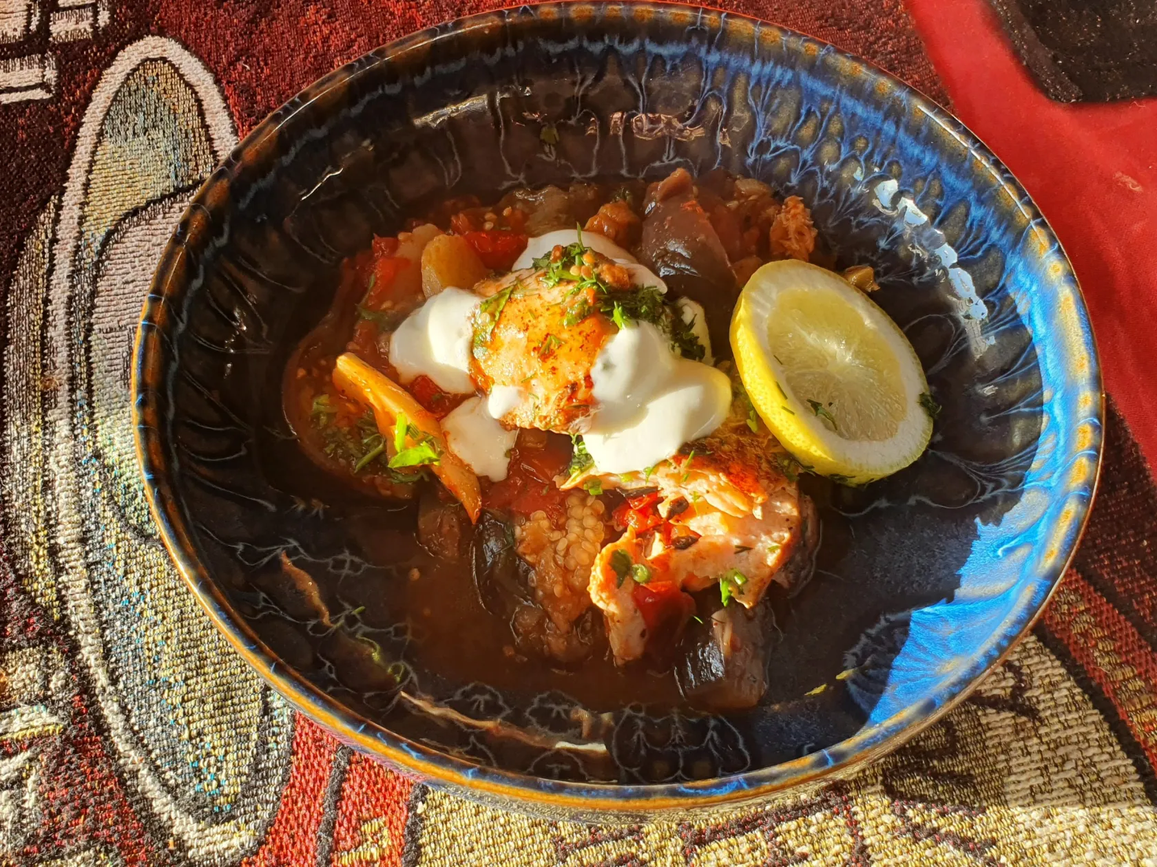 In einem Schmortopf mit Deckel die Auberginen und Kartoffeln einfüllen und mit den geschmorten Tomatensugo auffüllen. Im Ofen bei 180 Grad ca. 30 min schmorren lassen.