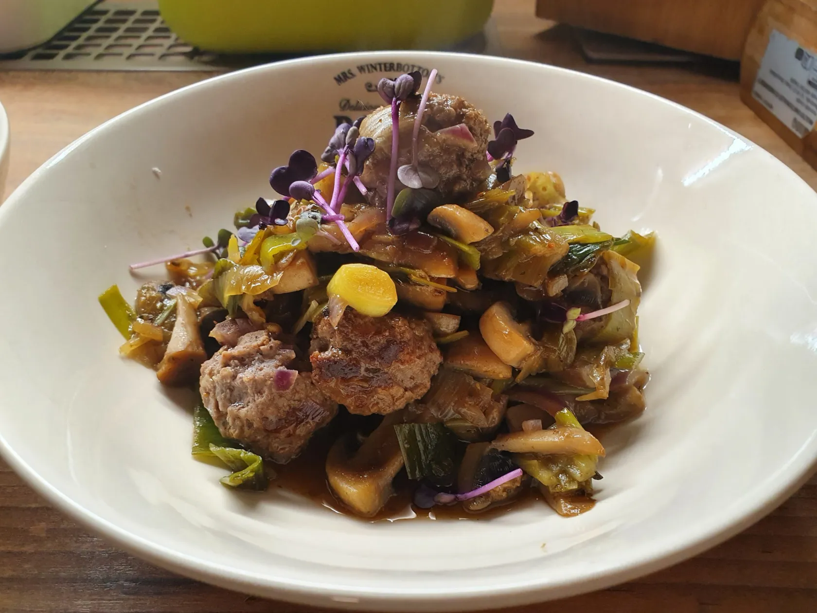 Das Gemüse in eine Schüssel geben und das Hack in kleine Klösse rollen und in der Pfanne anbraten. Wenn die Klöße 5 min von allen Seiten angebraten sind, gebt das Gemüse wieder dazu und lasst alles noch einmal kurz heiß werden. Die restlichen 50 ml Brühe dazugeben und abschmecken und servieren.