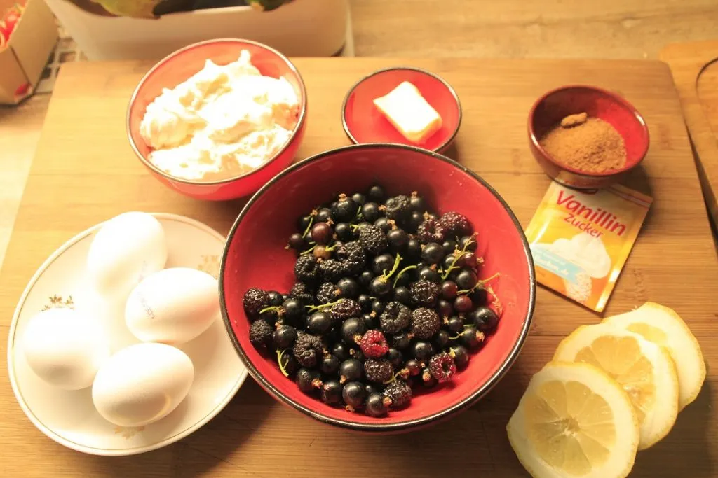 Den Ofen auf 220 Grad heizen. Die Beeren waschen und von den Stielen abzupfen. Die Eier trennen, das Eiweiß mit einer Prise Salz steif schlagen und dabei den Vanillezucker einrieseln lassen. Quark, Vanillezucker, 4 Eigelb, etwas Zitronensaft und den Abrieb, miteinander cremig rühren. Das steif geschlagene Eiweiß unter die Masse heben.