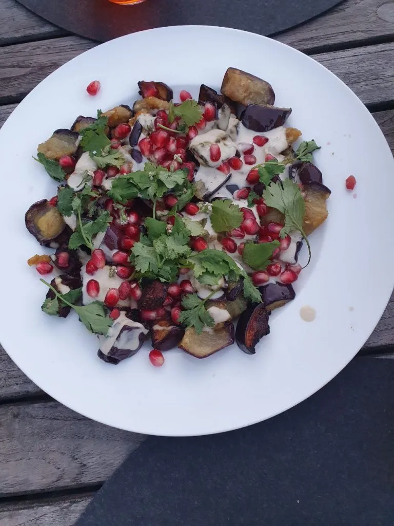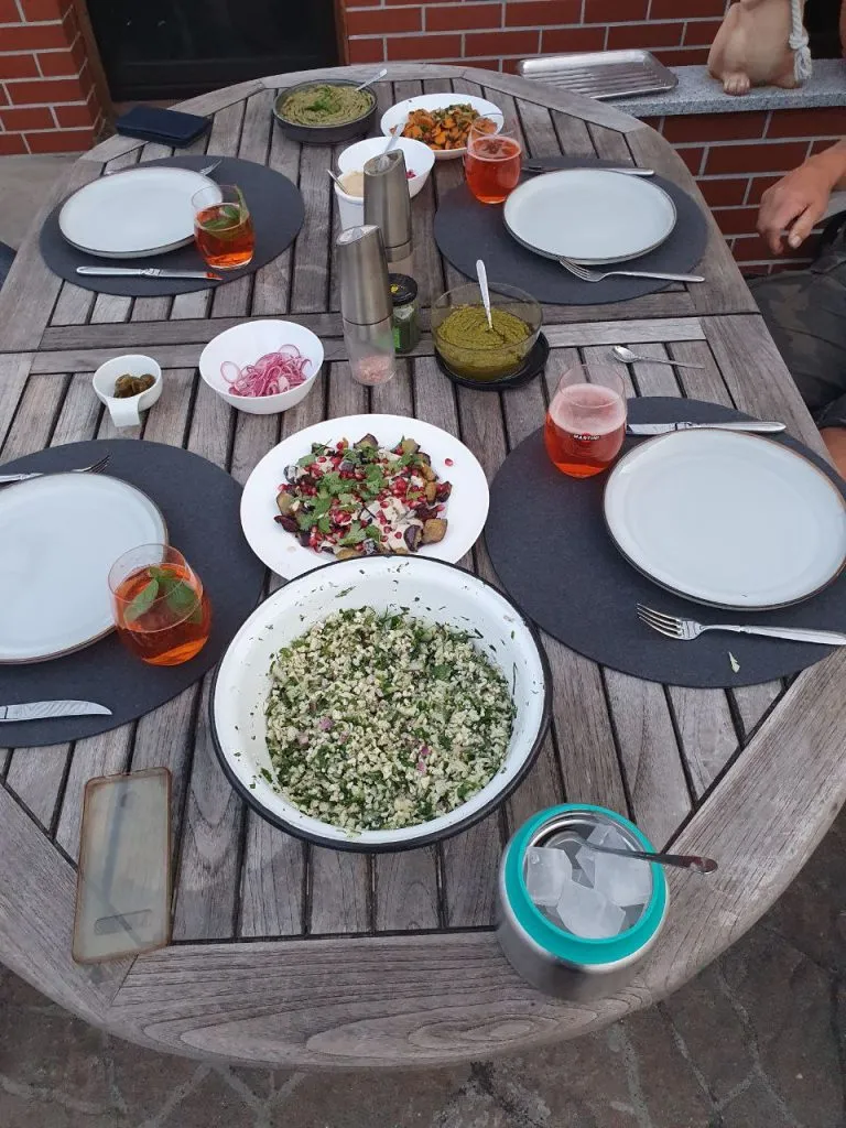 So gab es die leckere „Matbucha“-Sosse mit frischen Tomaten und Paprika, Grillfleisch, Blumenkohltaboulé mit Wildkräutern, gegrillte marinierten Chicoree und Auberginensalat. Wir hatten einen schönen Abend bei vielen Leckereien.