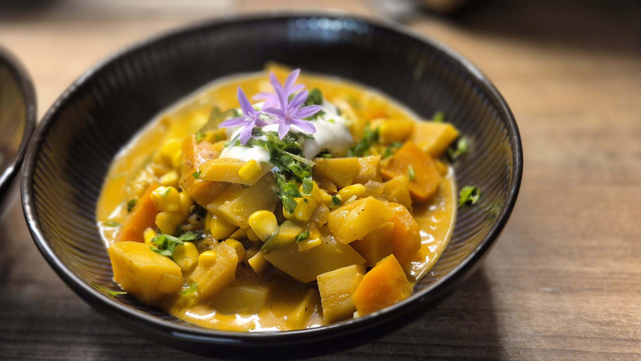 Wenn die Maiskolben gar nicht, lasst sie etwas abkühlen und schneidet mit einem scharffen Messer die Maiskörner vom Kolben runter. Die Maiskörner gebt ihr zum Curry dazu und gießt die Kokosmilch dazu. Alles nochmal 5 min köcheln lassen und wenn das Gemüse weich ist schmeckt ihr das Curry ab und gebt die frisch geschnittenen Kräuter dazu.