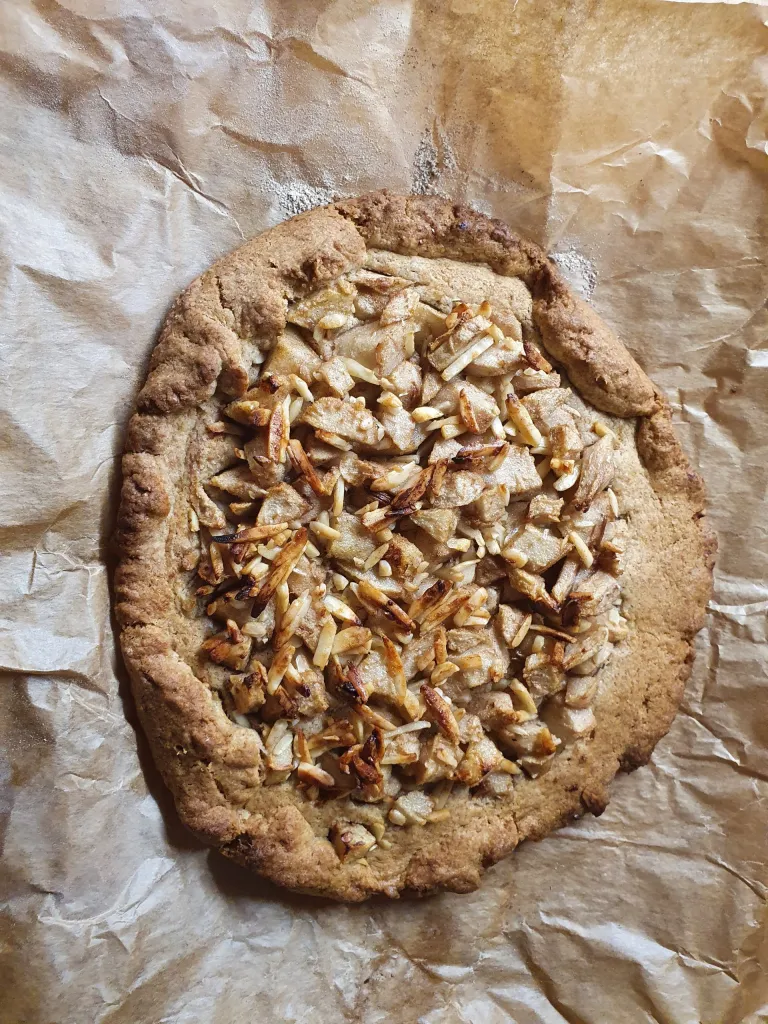 Den Teig aus dem Kühlschrank nehmen und zügig auf Backpapier ausrollen. Die Birnen abschälen, entkernen und klein schneiden. Mit 1 TL Rohrzucker und Zimt vermischen und auf den Teig geben. Einen Rand von 2 cm aussparen. Die Mandeln über die Birnen geben und den Teigrand nach innen klappen bis zur Birnenfüllung.