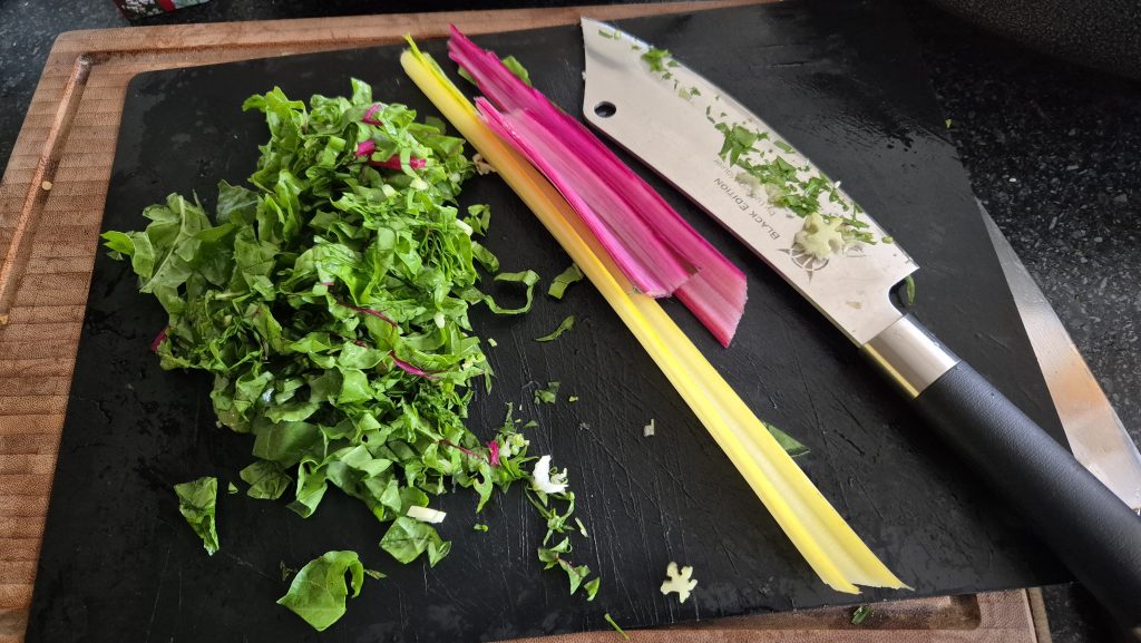 Unser Mangold wuchert im Hochbeet in alle Richtungen und er leuchtet richtig mit seinen bunten Stengeln. Der Mangold schmeckt würzig und erdig. Er passt zu Bohnen, geräuchertem Tofu und auch zu Fleisch. So habe ich eine große Portion schöner Mangoldblätter gepflückt und ab damit auf den Grill.