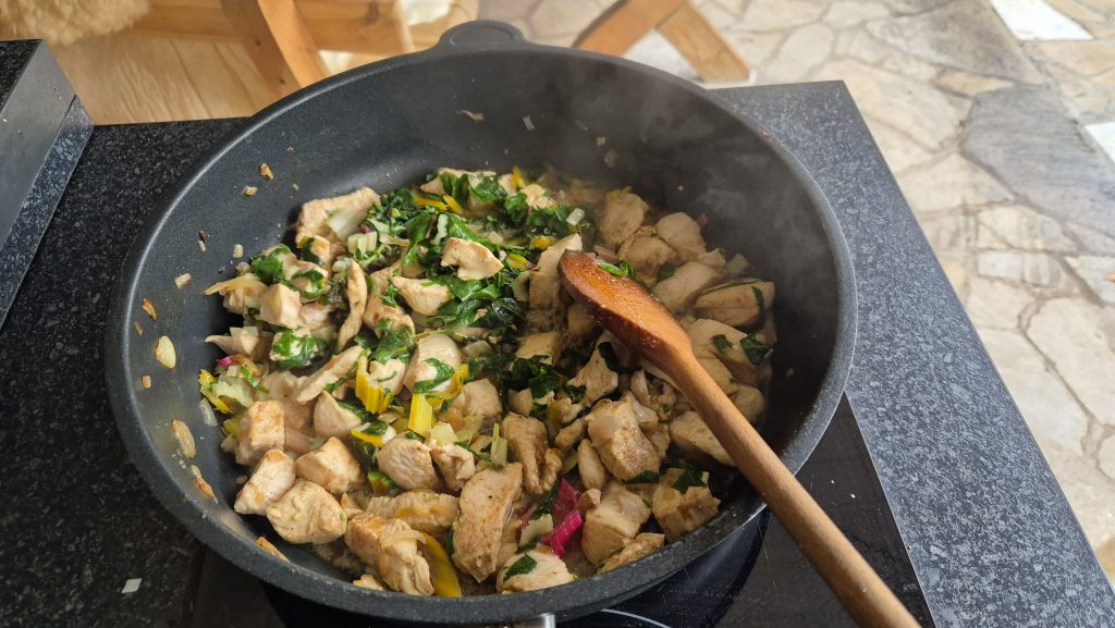 Die Ziebeln und den Knoblauch fein hacken. Das Hühnerfleisch in kleine Stücke schneiden und mit Salz und Pfeffer würzen. Tomaten klein schneiden. Die Stiele in Scheiben schneiden und zur Seite legen. Die Mangoldblätter von den Stielen zupfen und und grob hacken.