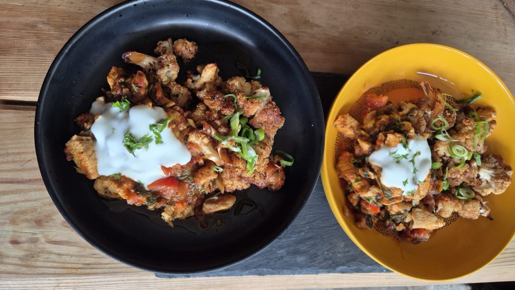 In einer Pfanne 1 EL Kokosöl erwärmen und die Zwiebel Knoblauch und Thymian anbraten, im Anschluss das Hühnchenfleisch hinzufügen und gut anbraten lassen. Mit etwas Brühe ablöschen und 5 min schmoren lassen. Dann die Mangoldstiele hinzugeben und alles 2-3 weitere Minuten weiter köcheln lassen Zum Schluss noch die geschnittenen Mangoldblätter hinzufügen und alles weitere 5 min köcheln lassen. Abschmecken mit Salz und Pfeffer und einem Spritzer Zitrone. Dazu passt frisches Brot oder auch geschmorter Blumenkohl.