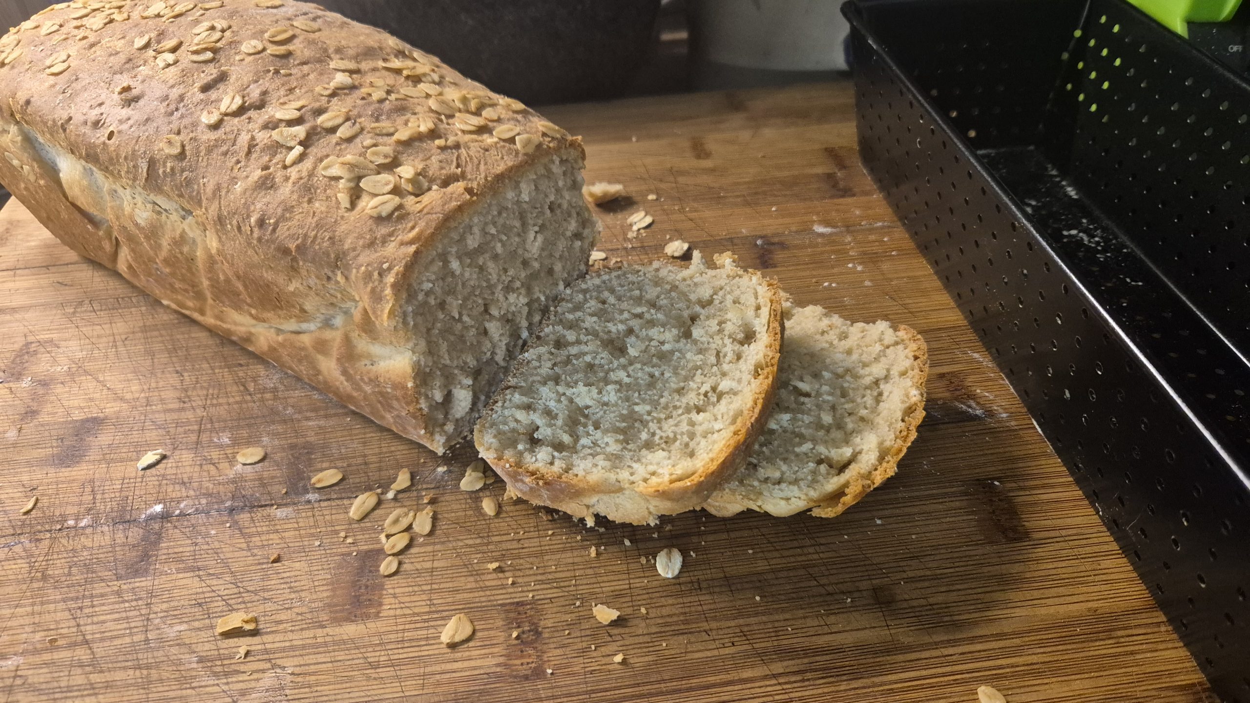 Den Brotlaib mit etwas Olivenöl beträufeln und mit einem EL Haferflocken bestreuen. Das Brot 35 bis 40 min backen lassen. Das Brot kurz abkühlen lassen und dann kann es auch schon geschnitten werden.