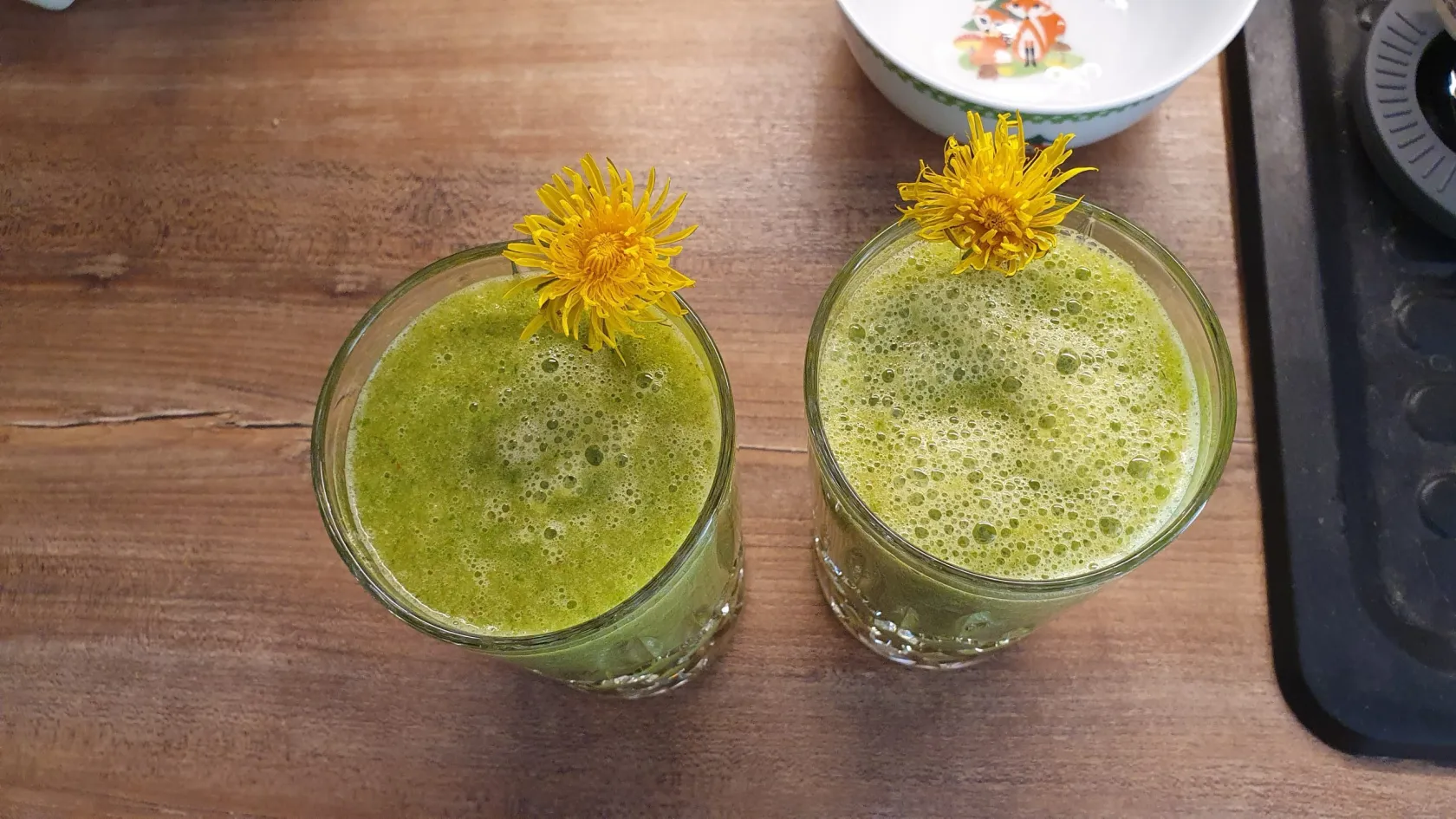Den Apfel in Stücke schneiden, Orange schälen und in Stücke schneiden. Von der Zitrone ein Stück abschneiden und in den Mixer geben. Den Rest der Zitrone auspressen. Die Wildkräuter abspülen und mit dem Wasser in den Mixer geben. Alles gut vermixen und dann in 2 Gläser geben. Mit einer Löwenzahnblüte dekorieren, die kann man natürlich auch essen.