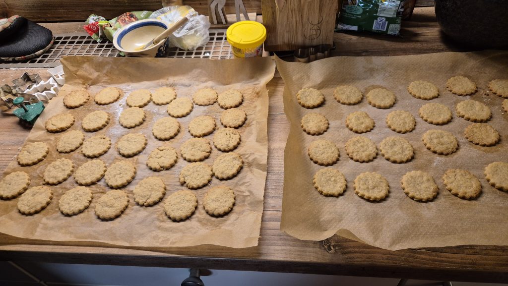 Den Teig ausrollen und mit Stern oder mit runder Ausstechform ausstechen und ca. 8-10 min nicht zu dunkel backen und auskühlen lassen.