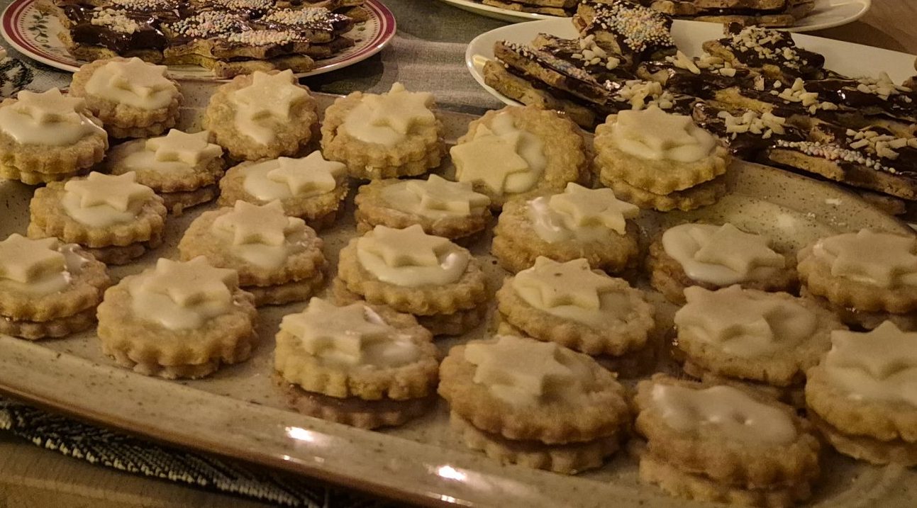 Das Gelee fein rühren und auf die eine Hälfte der abgekühlten Plätzchen streichen. Ein weiteres Plätzchen darauf setzen.
